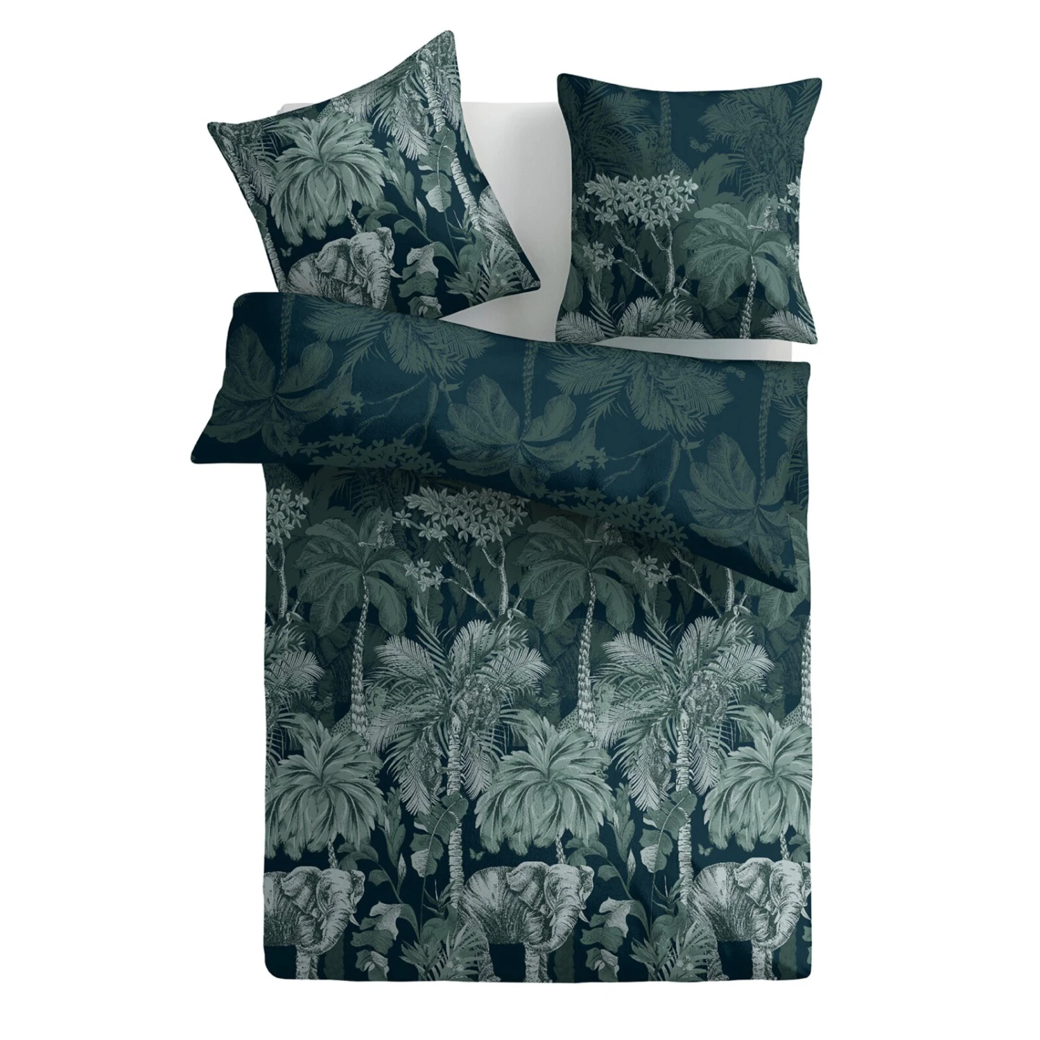Diese Baumwoll-Bettwäsche präsentiert sich in einem schönen Naturmotiv mit Bäumen und Elefanten. Sie wurde aus hautfreundlicher Baumwolle gefertigt und ist sowohl am Kopfkissen-, als auch am Bettdeckenbezug jeweils mit einem praktischen Reißverschluss versehen. Zudem kann die Bettwäsche bei bis zu 60°C gewaschen und getrocknet werden.