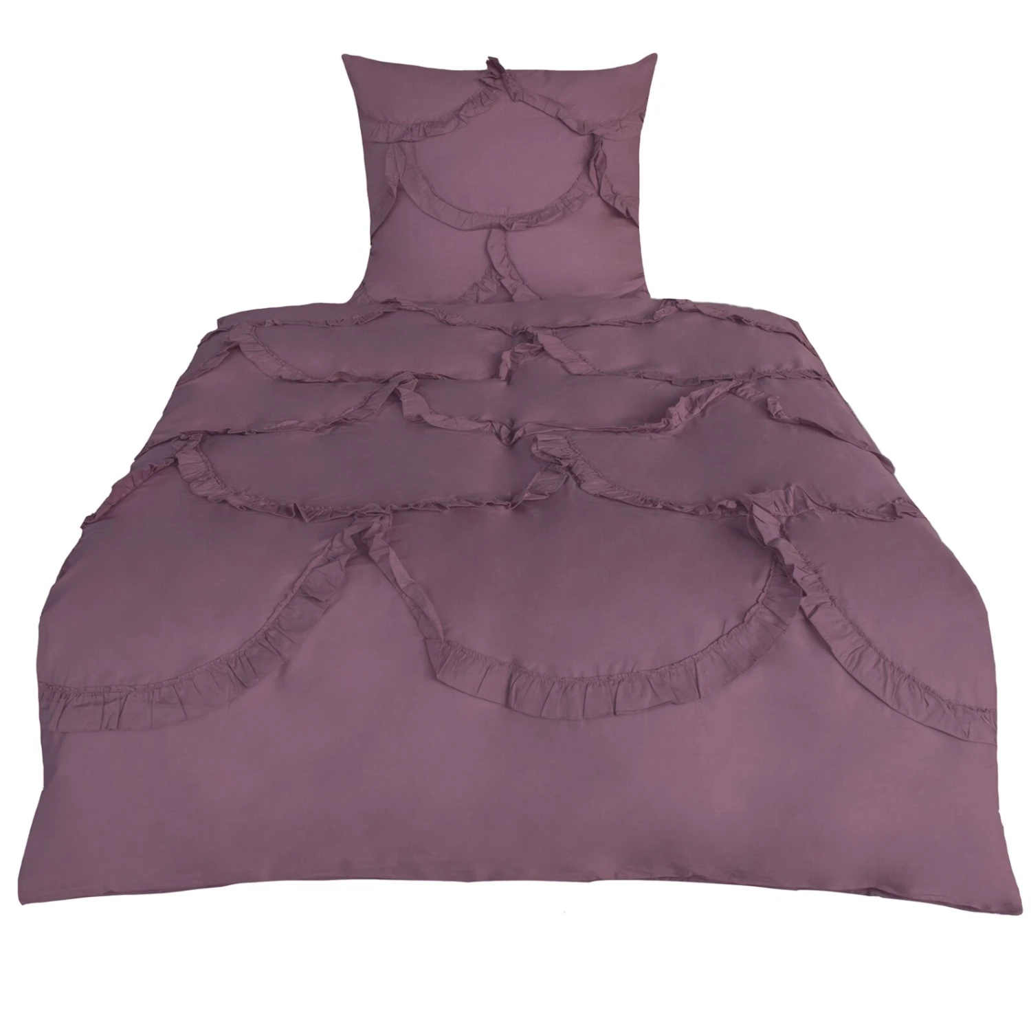 Die dekorativen Rüschen machen diese mauvefarbene Baumwoll-Bettwäsche zum echten Hingucker in Ihrem Schlafzimmer. Sie wird für ein romantisches Ambiente sorgen. Kopfkissen- und Bettdeckenbezug sind beide mit einem praktischen Reißverschluss versehen und lassen sich bei 60°C waschen.