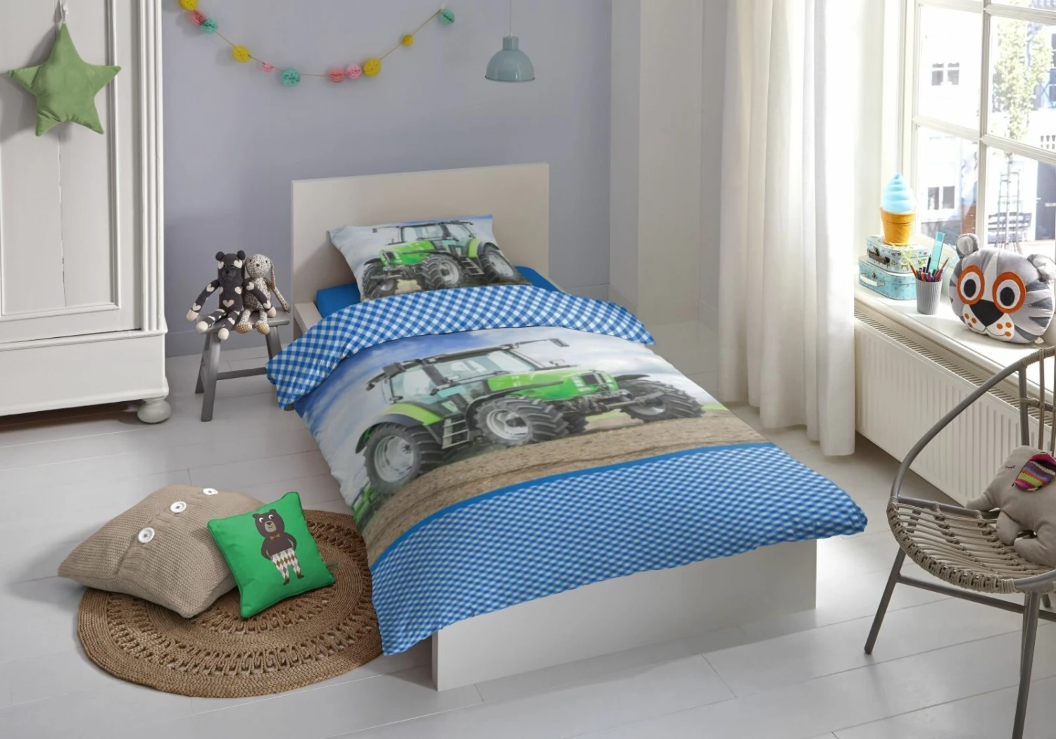 Diese Bettwäsche ist für alle Landjungs und die, die es mal werden wollen. Ein großer grüner Trecker ist auf die Bezüge bedruckt, die zur erleichterten Bedienung mit Reßverschlüssen bestückt sind. Gewaschen werden können die bezüge bei etwa 40 grad im Schonwaschgang.