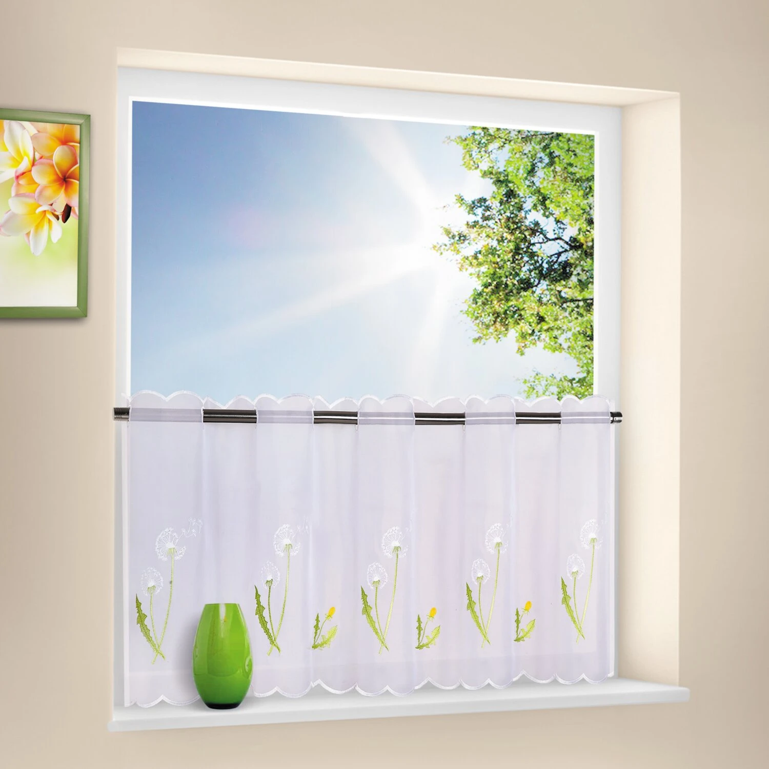 Diese transparente Scheibengardine aus Voile wurde in wunderschöner Feinarbeit bestickt. Der obere und untere Rand, sowie die Aussparungen für Stangendurchführung wurden verstärkt. Die Stickereien in Grün und Gelb erinnern an Löwenzahn und bringen den Frühling in Ihre Wohnung. der Stoff ist transparent, so dass das Tageslicht Ihre Räume weiterhin durchfluten kann.