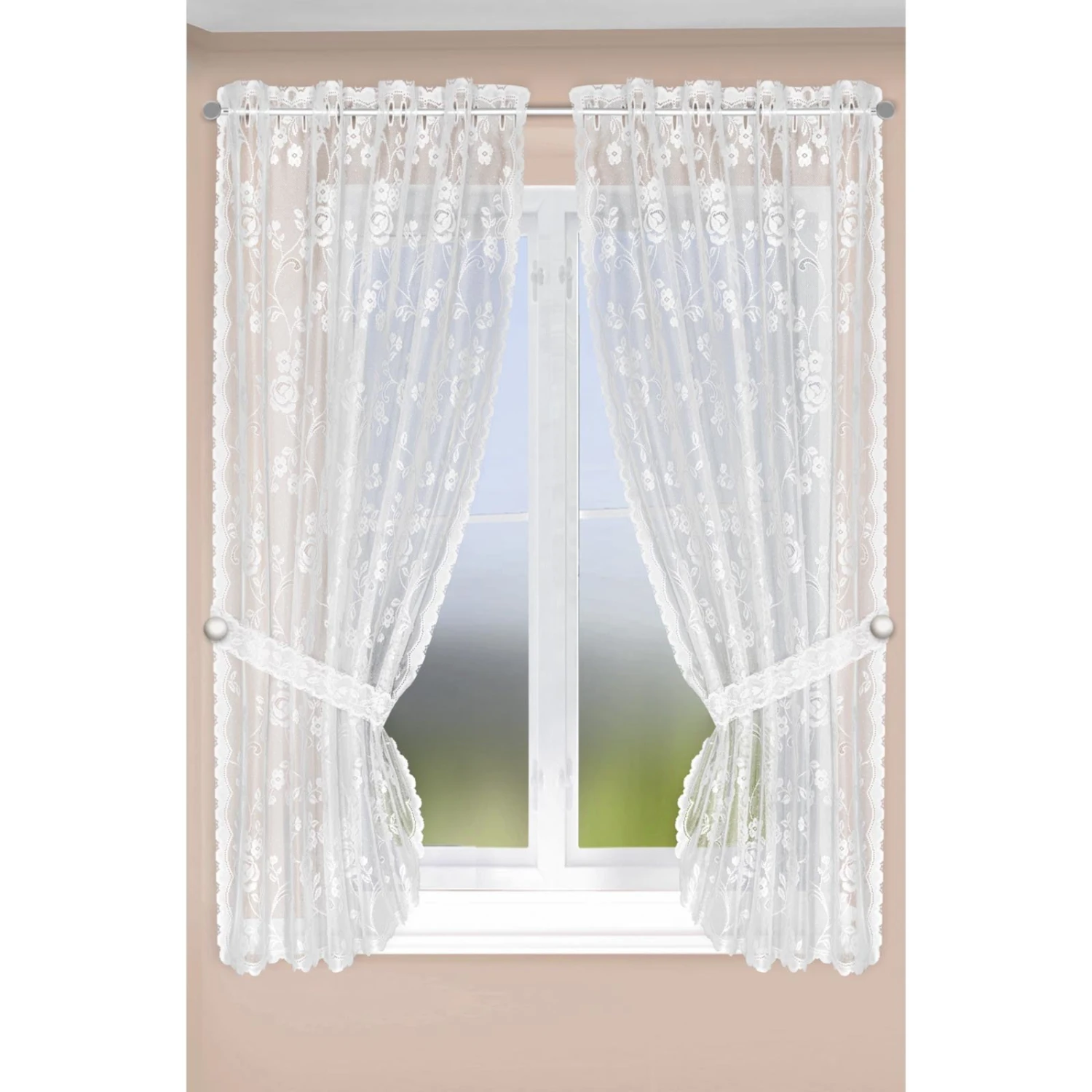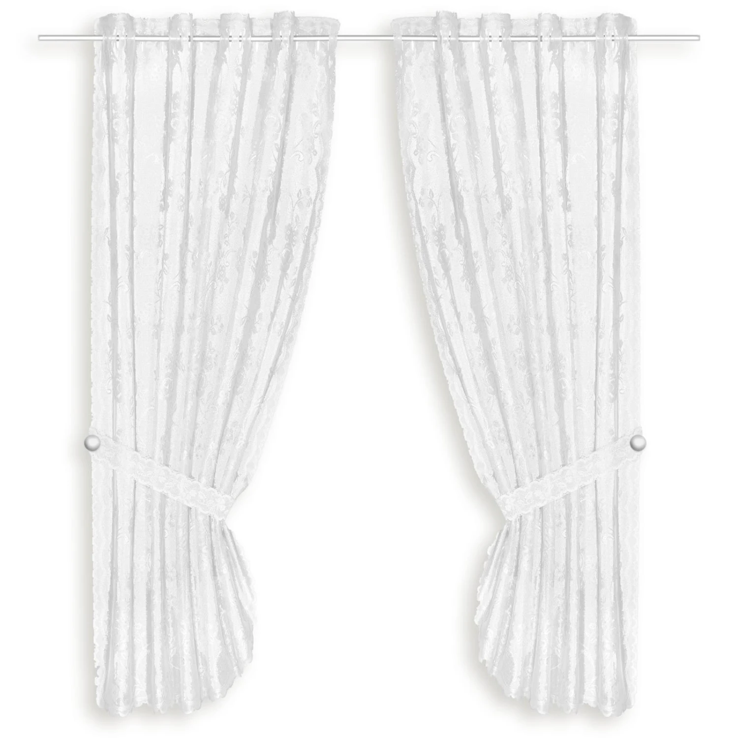 Dieses weiße Gardinen-Set wird für charmantes Wohnambiente in Ihren vier Wänden sorgen. Die Raffhalter sind im Lieferumfang mit inbegriffen, sodass Sie den transparenten Stoff festbinden können.