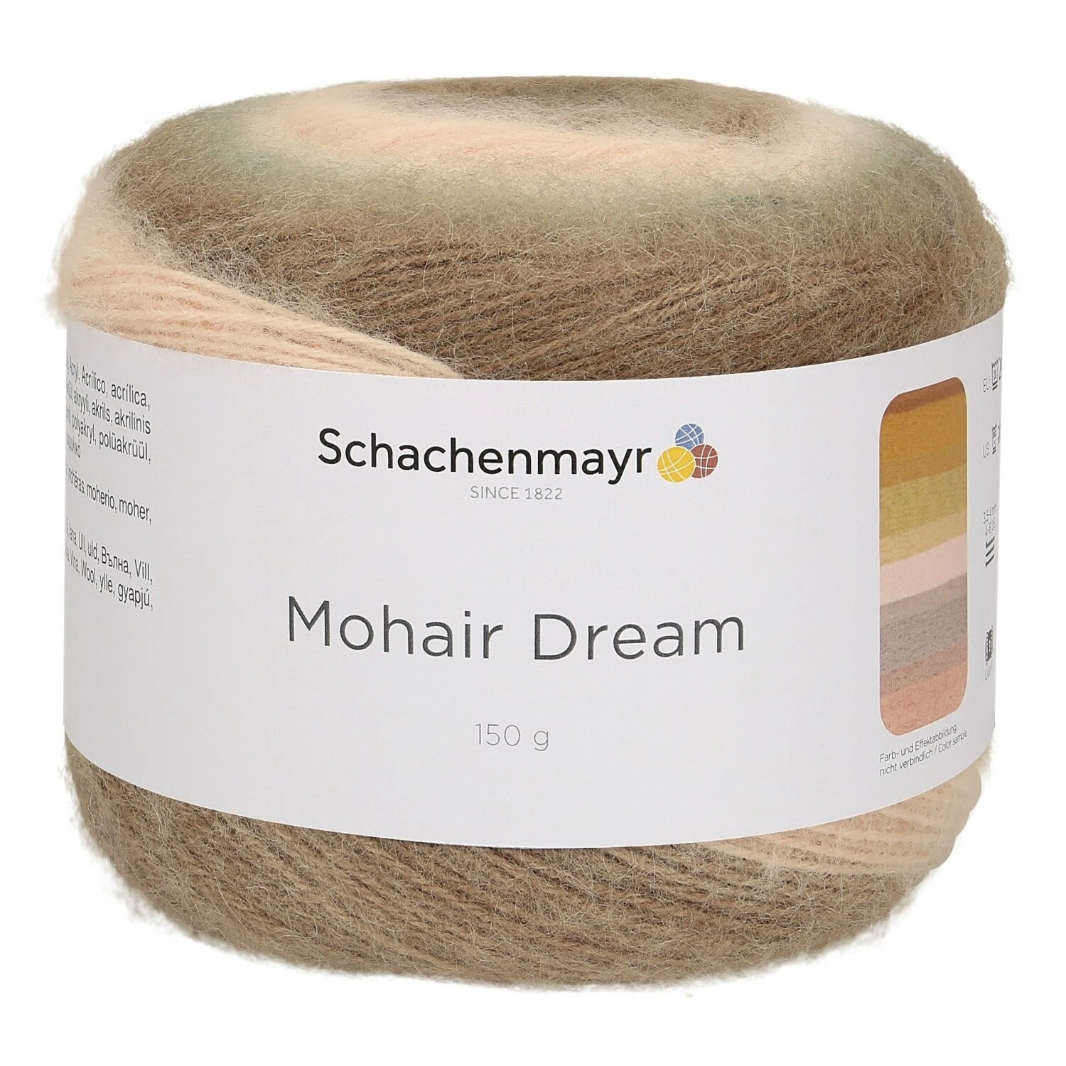 Das Garn Mohair Dream in der Farbgebung Silence-Color ist Beige-Braunfarben und ein feines Lacegarn. Mit Farbverlauf und einem leichten Mohair-Flausch wirkt es soft und leicht. Es ist Dank seiner Ergiebigkeit gut geeignet für Tücher oder andere Accessoires. Lassen Sie ihrer Kreativität freien Lauf.