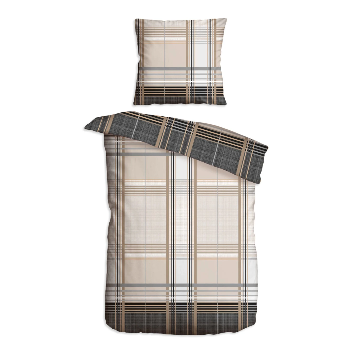 Microfaser-Bettwäsche mit kariertem Muster in den Farben Anthrazit und Natur . Microfaser ist ein besonders angenehmer Stoff, der im Sommer kühlt und im Winter wärmt. Mit dem Reißverschluss lässt sich die Bettwäsche ganz einfach be- und abziehen.