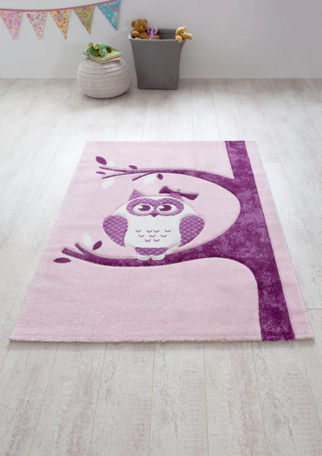Schöner Teppich für das Kinderzimmer. Das Maß beträgt etwa 120 x 170 cm und ist mit einem tollen Eulen-Motiv versehen. Die Grundfarbe ist Rosa/Purple mit der dargestellten Eule in der Mitte.