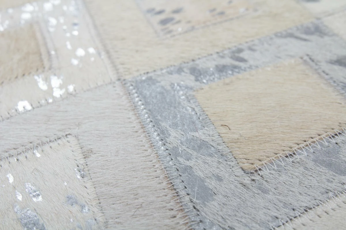 Der wunderschöne Lederteppich mit eingearbeiteten Applikationen aus metallischer Folie rundet jeden edlen Einrichtungsstil gekonnt ab. Der hochwertige Edel-Teppich aus 100 % Leder überträgt einen individuellen Touch auf seine Umgebung und erzeugt ein ganz besonderes Flair. Von Hand gefertigt ist jeder einzelne Lederteppich ein Unikat und die Verwendung von edlen Naturmaterialien trägt auch ihren Teil dazu bei, denn bei Naturprodukten kann es in Form, Farbe und Muster zu Abweichungen kommen.Gegebenenfalls kann das natürliche Fell nach einiger Zeit und bei hoher Beanspruchung an Haaren verlieren. Ebenso könnte sich die Metallicfolie unter Umständen ablösen. Dies ist dem Naturprodukt und der Beschaffenheit des Fells geschuldet und kein Produktionsfehler oder Qualitätsmangel. Er eignet sich für alle Räumlichkeiten und das moderne Rautenmuster verleiht dem Produkt eine ganz besondere Note, außerdem kommt er in Kombination mit verschiedenen Möbeln gut zur Geltung. Naturfaser-Teppiche fangen Fusselwolken ein und sind daher besonders gut für Allergiker geeignet, da sie gleich abgesaugt werden können. Der extra bequeme Lederteppich ist ein Alleskönner, der in jedem Bereich punktet. Des Weiteren ist der Teppich sehr pflegeleicht und wärmeisolierend um kalte Füße zu bekämpfen. Verleihen Sie Ihren Räumen das gewisse Etwas und schaffen Sie Ihre eigene Relax-Insel in verschiedenen Nuancen. Selbst die kleinste Wohnung lässt sich mit diesem wundervollen Naturteppich persönlich einrichten, denn er ist in verschiedenen Größen erhältlich.