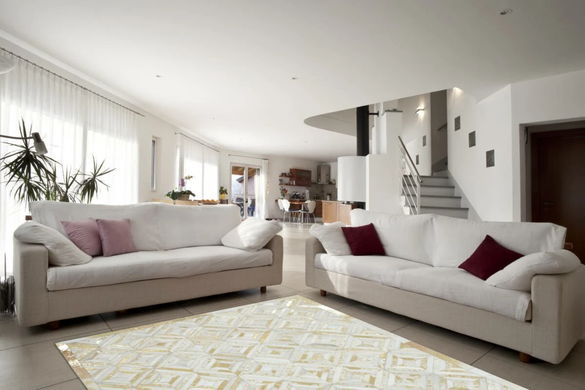 Der wunderschöne Lederteppich mit eingearbeiteten Applikationen aus metallischer Folie rundet jeden edlen Einrichtungsstil gekonnt ab. Der hochwertige Edel-Teppich aus 100 % Leder überträgt einen individuellen Touch auf seine Umgebung und erzeugt ein ganz besonderes Flair. Von Hand gefertigt ist jeder einzelne Lederteppich ein Unikat und die Verwendung von edlen Naturmaterialien trägt auch ihren Teil dazu bei, denn bei Naturprodukten kann es in Form, Farbe und Muster zu Abweichungen kommen.Gegebenenfalls kann das natürliche Fell nach einiger Zeit und bei hoher Beanspruchung an Haaren verlieren. Ebenso könnte sich die Metallicfolie unter Umständen ablösen. Dies ist dem Naturprodukt und der Beschaffenheit des Fells geschuldet und kein Produktionsfehler oder Qualitätsmangel. Er eignet sich für alle Räumlichkeiten und das moderne Rautenmuster verleiht dem Produkt eine ganz besondere Note, außerdem kommt er in Kombination mit verschiedenen Möbeln gut zur Geltung. Naturfaser-Teppiche fangen Fusselwolken ein und sind daher besonders gut für Allergiker geeignet, da sie gleich abgesaugt werden können. Der extra bequeme Lederteppich ist ein Alleskönner, der in jedem Bereich punktet. Des Weiteren ist der Teppich sehr pflegeleicht und wärmeisolierend um kalte Füße zu bekämpfen. Verleihen Sie Ihren Räumen das gewisse Etwas und schaffen Sie Ihre eigene Relax-Insel in verschiedenen Nuancen. Selbst die kleinste Wohnung lässt sich mit diesem wundervollen Naturteppich persönlich einrichten.
