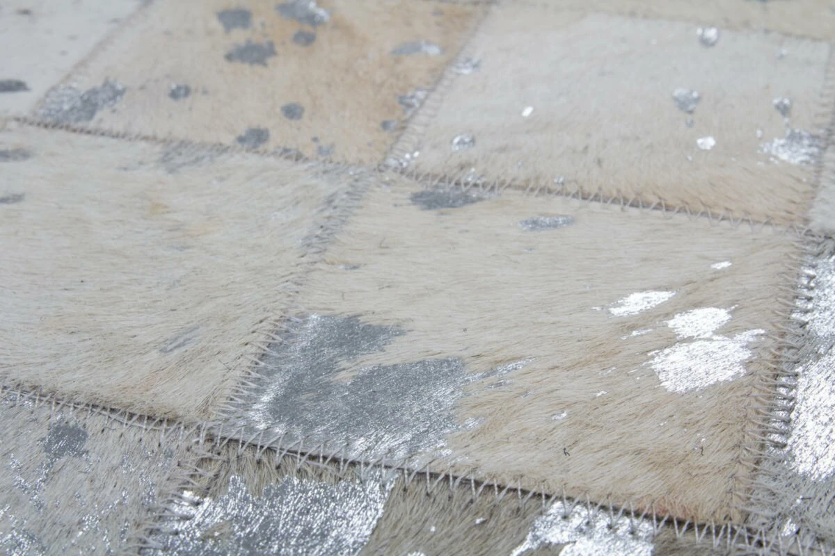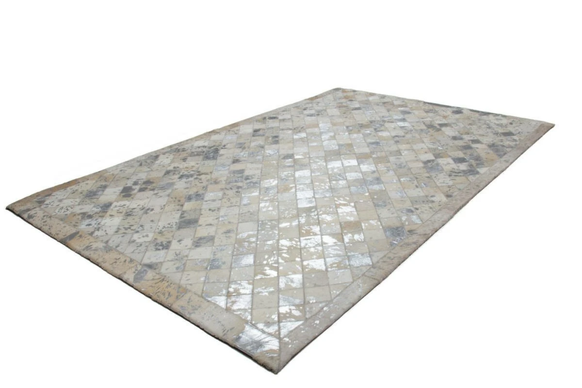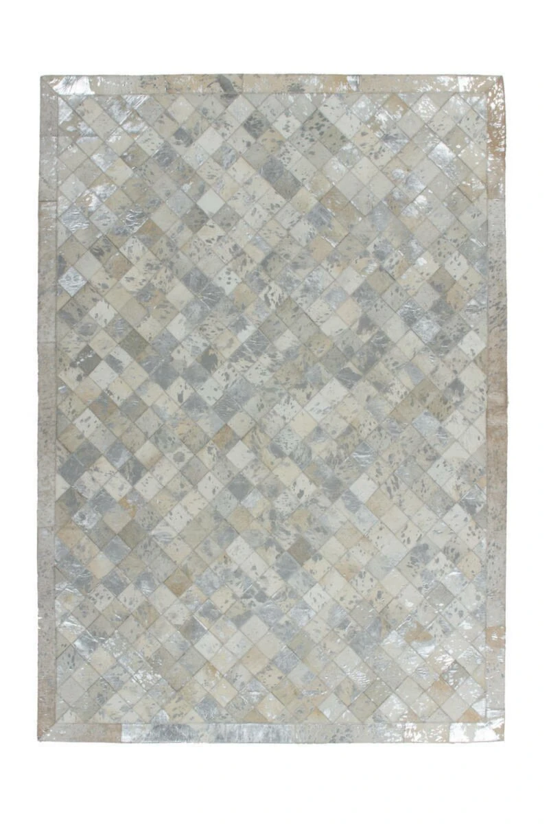 Dieser hochwertige Patchwork-Teppich aus 100% Leder gibt Ihrer Einrichtung einen modernen und individuellen Touch. Von Hand gefertigt ist jeder einzelne Lederteppich ein Unikat. Die Verwendung von edlen Naturmaterialien und die hochwertige Verarbeitung sorgen für ein dynamisches Aussehen, das seinesgleichen sucht. Mit einem stilvollen Karo-Design, verströmt dieser Teppich Luxus pur. Das Naturmaterial behält auch bei starker Beanspruchung seine Form und Haptik bei und ist daher sehr langlebig. Bei Naturprodukten kann es zu natürlichen Unregelmäßigkeiten in Form, Farbe und Muster kommen. Das natürliche Fell kann nach einiger Zeit und bei hoher Beanspruchung gegebenenfalls an Haaren verlieren. Ebenso könnte sich die Silberfolie unter Umständen ablösen. Dies ist dem Naturprodukt und der Beschaffenheit des Fells geschuldet und kein Produktionsfehler Qualitätsmangel.