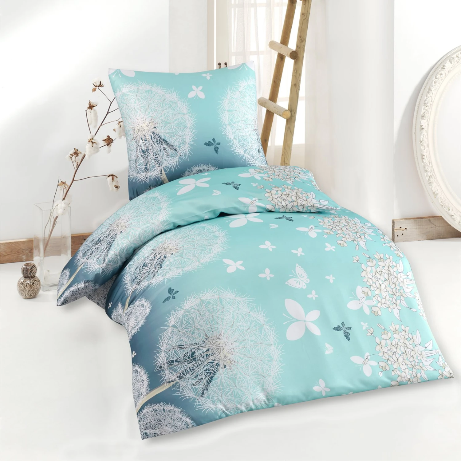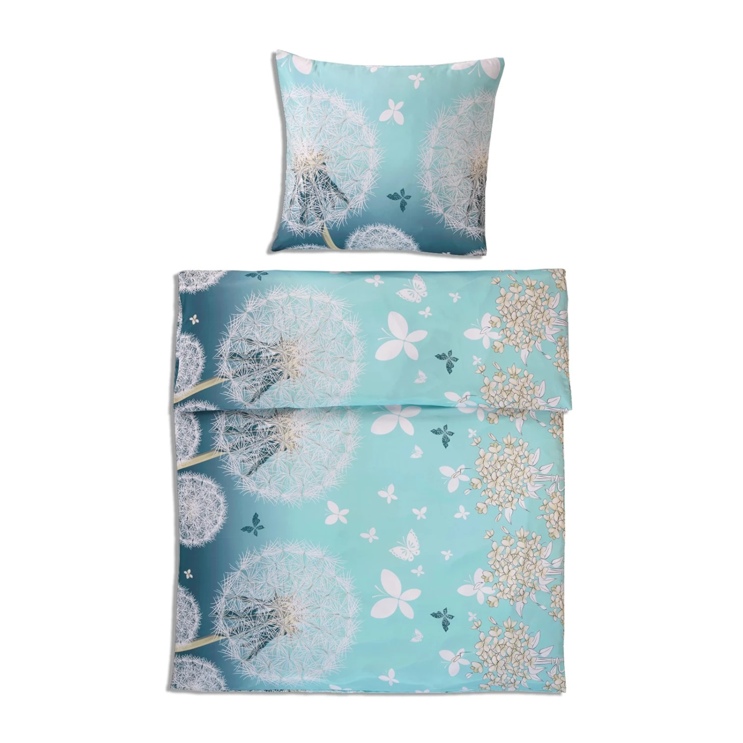 Ein Microfaser-Bezug ist für die warmen Tage genau das Richtige! Microfaser-Bettwäsche ist atmungsaktiv und transportiert die Feuchtigkeit gut ab. Diese beiden Bezüge für Kopfkissen und Bettdecke sind außerdem sehr hübsch anzusehen. Ein Muster, welches Frühlingsgefühle erwachen lässt. Große Pusteblumen die zu Schmertterlingen übergehen in verschiedenen Blautönen. da wacht man gerne auf und hört das Zwitschern der Vögel Der Kissenbezug mit Maßen von etwa 80 x 80 cm ist, ebenso wie der Deckenbezug mit Maßen von 135 x 200 cm, mit einem Reißverschluss ausgestattet. So geht das Bezüge Wechseln schnell von der Hand. Zu reinigen sind die Bezüge bei etwa 40°C und in den Trockner können sie problemlos.
