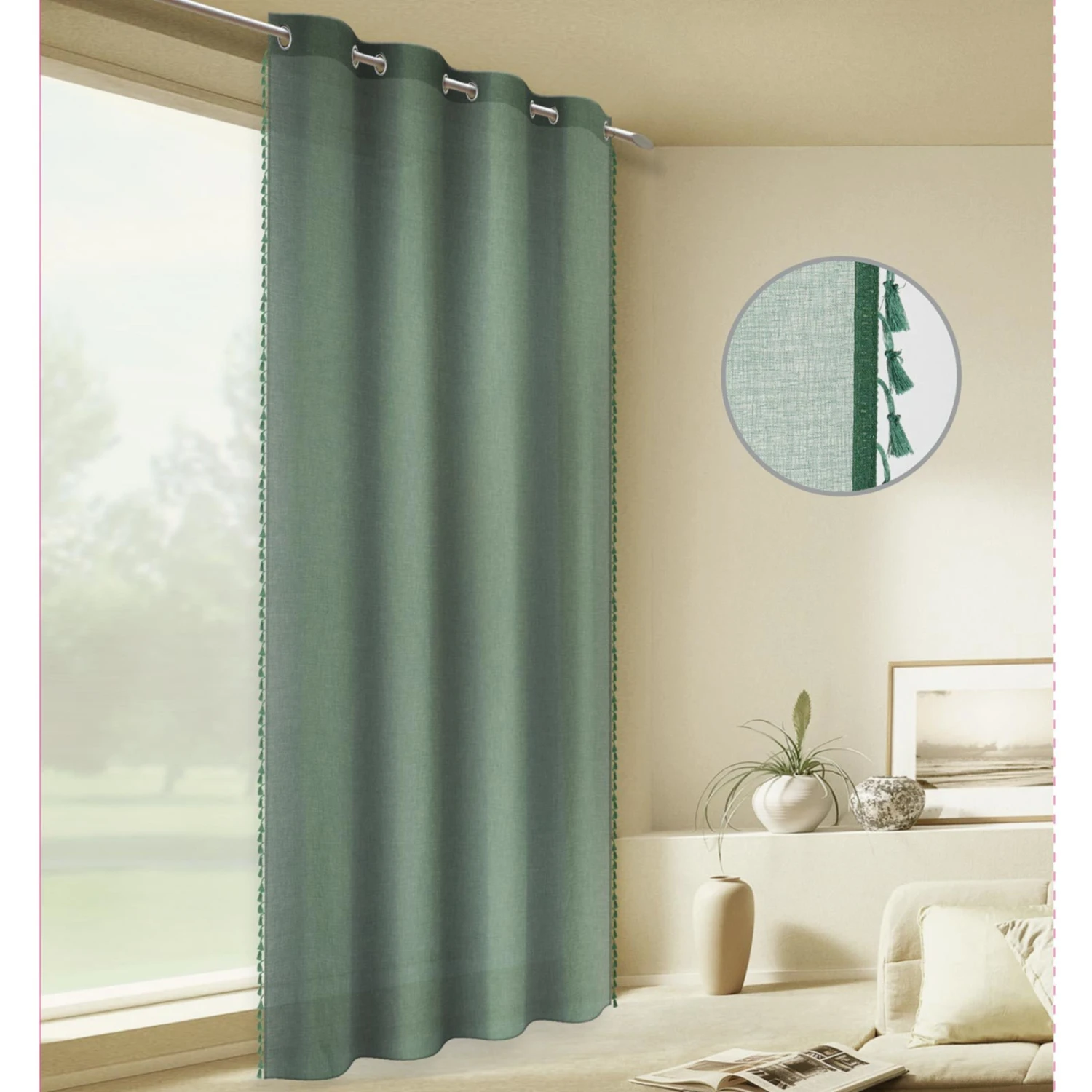 Dieser grüne Ösenvorhang ist an den Seiten mit dekorativen Bommeln ausgestattet, die ihn zum echten Hingucker in Ihrem Wohnbereich machen. Die Aufhängung der transparenten Gardine erfolgt ganz einfach über die Ösen, durch die die Gardinenstange geführt wird.