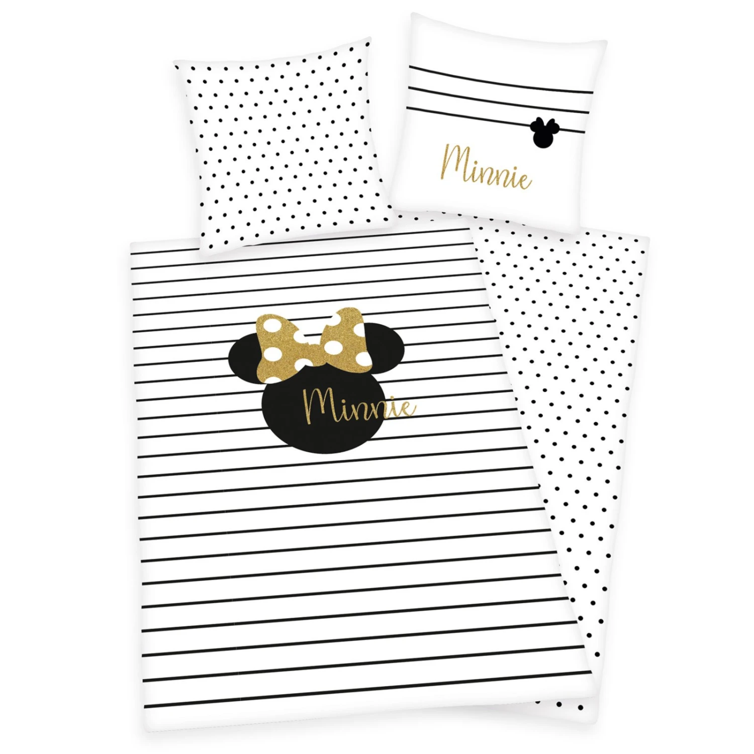 Das süße Minnie Mouse Motiv macht diese Renforcé-Bettwäsche zum echten Blickfang. Der goldene Aufdruck setzt auf dem weiß-schwarzen Hintergrund schöne Akzente und sticht stilvoll heraus. Die Bettwäsche wurde aus hautfreundlicher Baumwolle gefertigt und ist mit praktischen Reißverschlüssen ausgestattet.