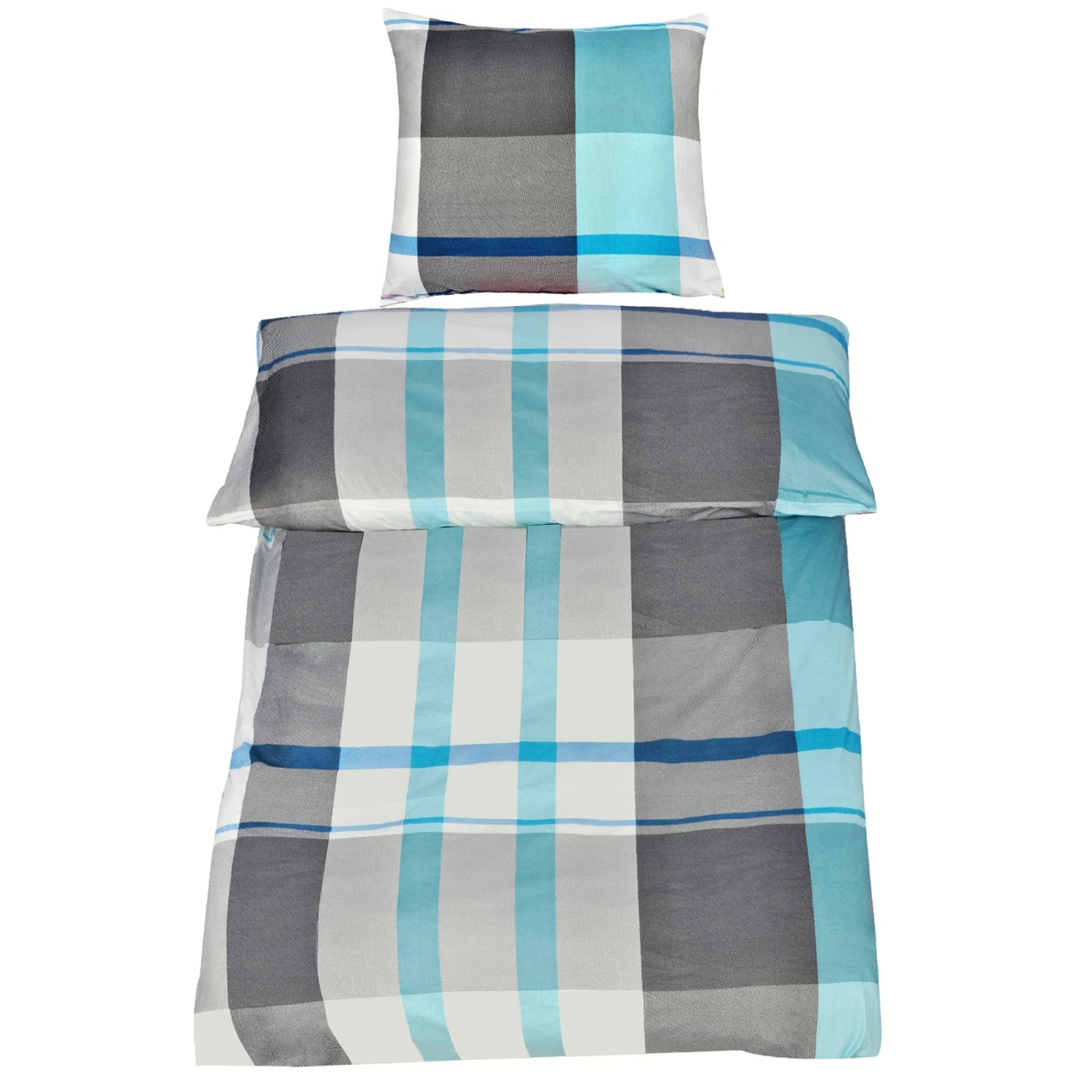 Weiche Renforcé-Bettwäsche mit Karomuster in modernen Petrol-grau-Tönen aus angenehmem Baumwollmaterial. Durch den Reißverschluss lässt sich diese Bettwäsche schnell und einfach wechseln.
