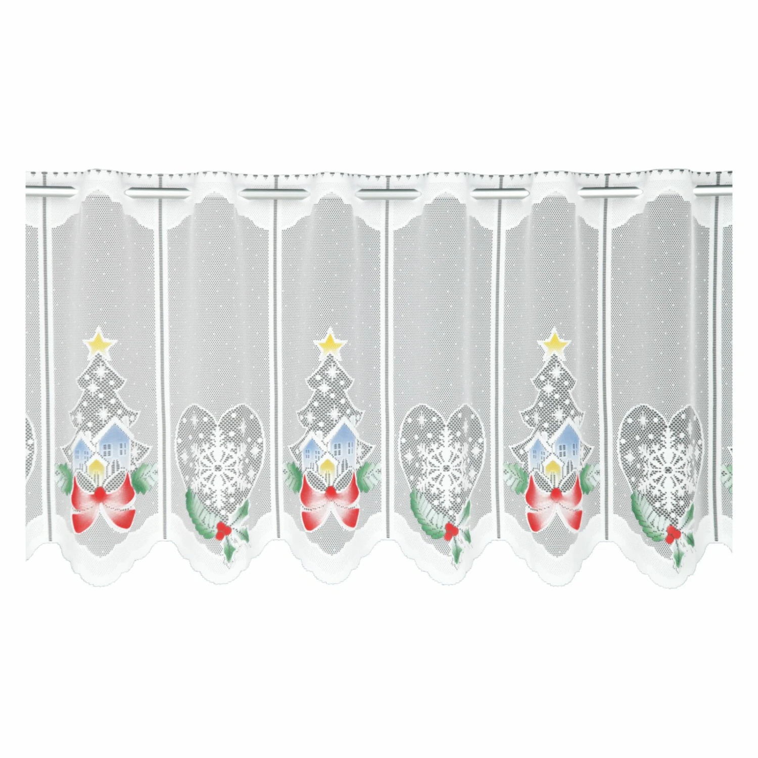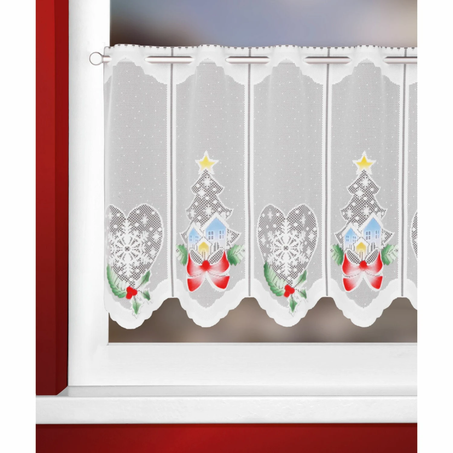 Diese Scheibengardine mit Herz- und Tannenbaum-Motiv überzeugt durch ihr zuckersüßes Design und taucht Ihre Fenster in ein herrlich weihnachtliches Ambiente. Die Gardine wird mittels einer Stangendurchführung aufgehangen und hat Maße von etwa 130 x 45 cm.