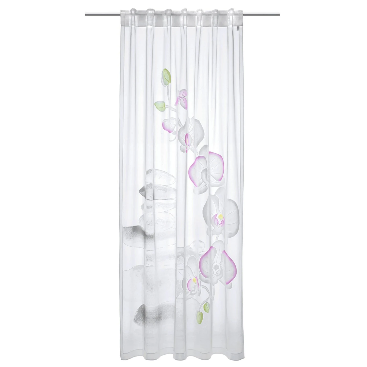 Jaquard-Schlaufenschal mit verdeckten Schlaufen. Diese Gardine mit Orchideen und Steinen in Grau und Rosa ist halbtransparent und aus pflegeleichtem Polyester.