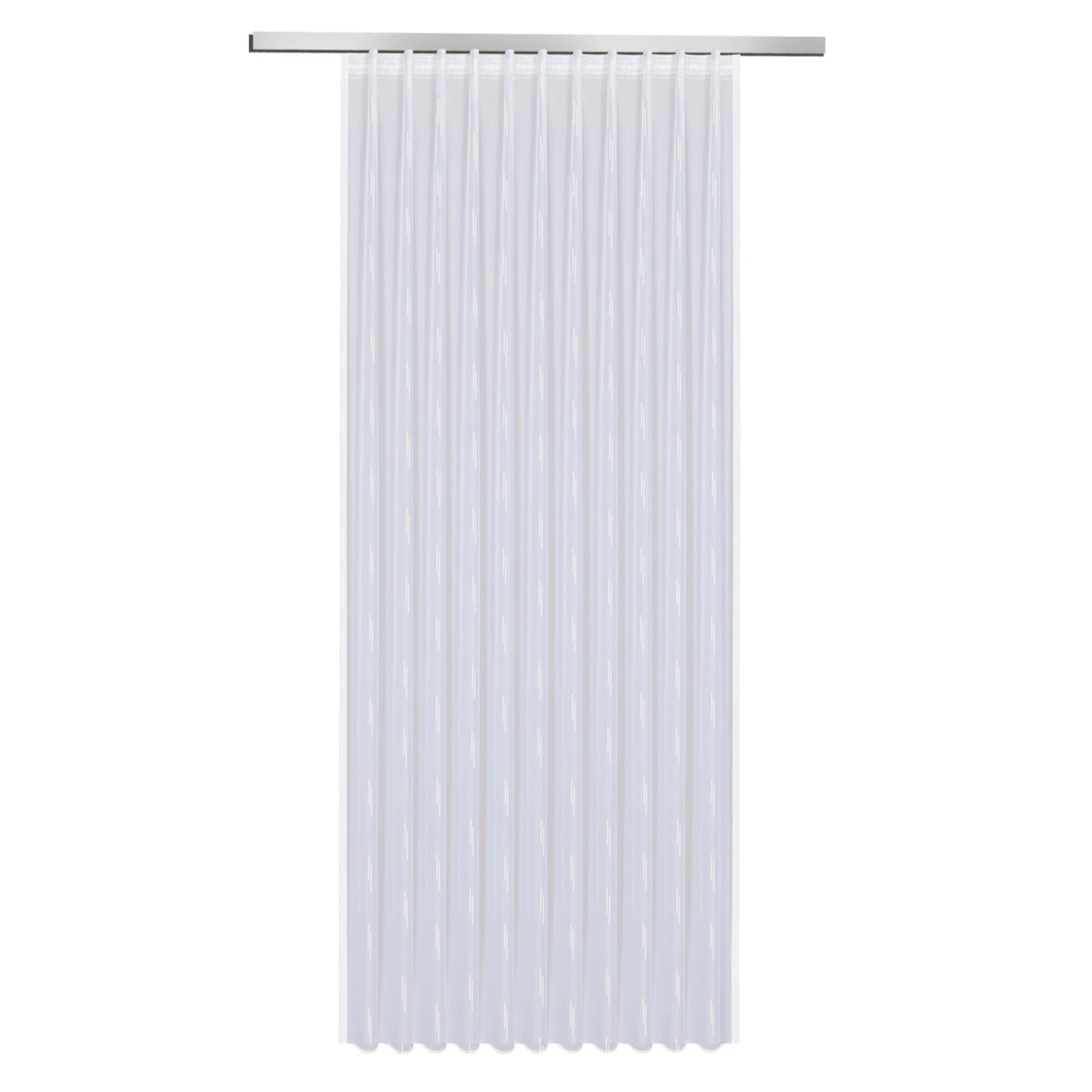 Moderner Gardinenstore aus weißer Voile-Grundware mit dekorativen, kurzen Längsstreifen in Beige. Die Gardine kann mit dem Einer-Faltenband durch Gardinenröllchen oder Gleiter an jeder handelsüblichen Gardinenschiene angebracht werden.