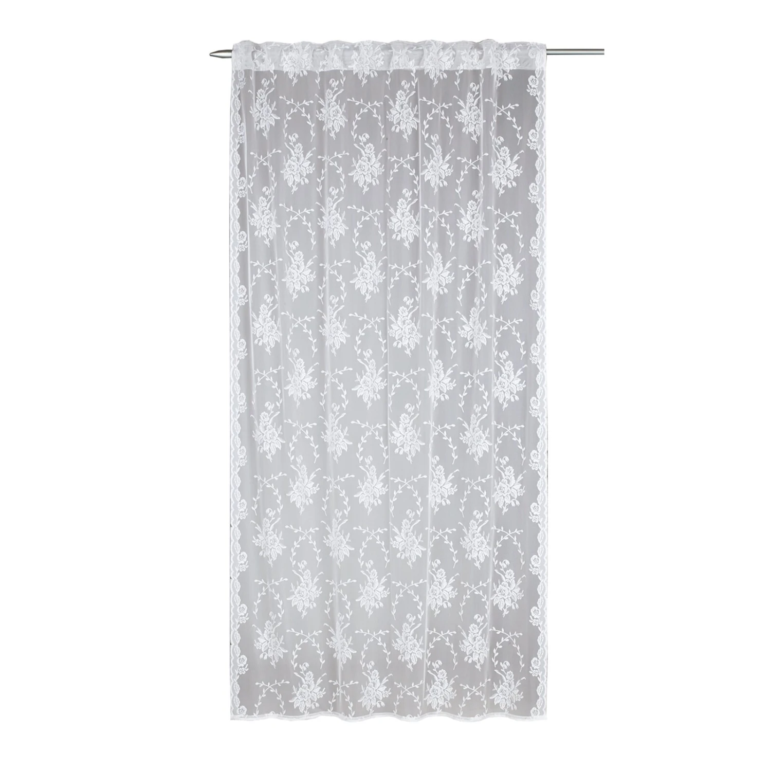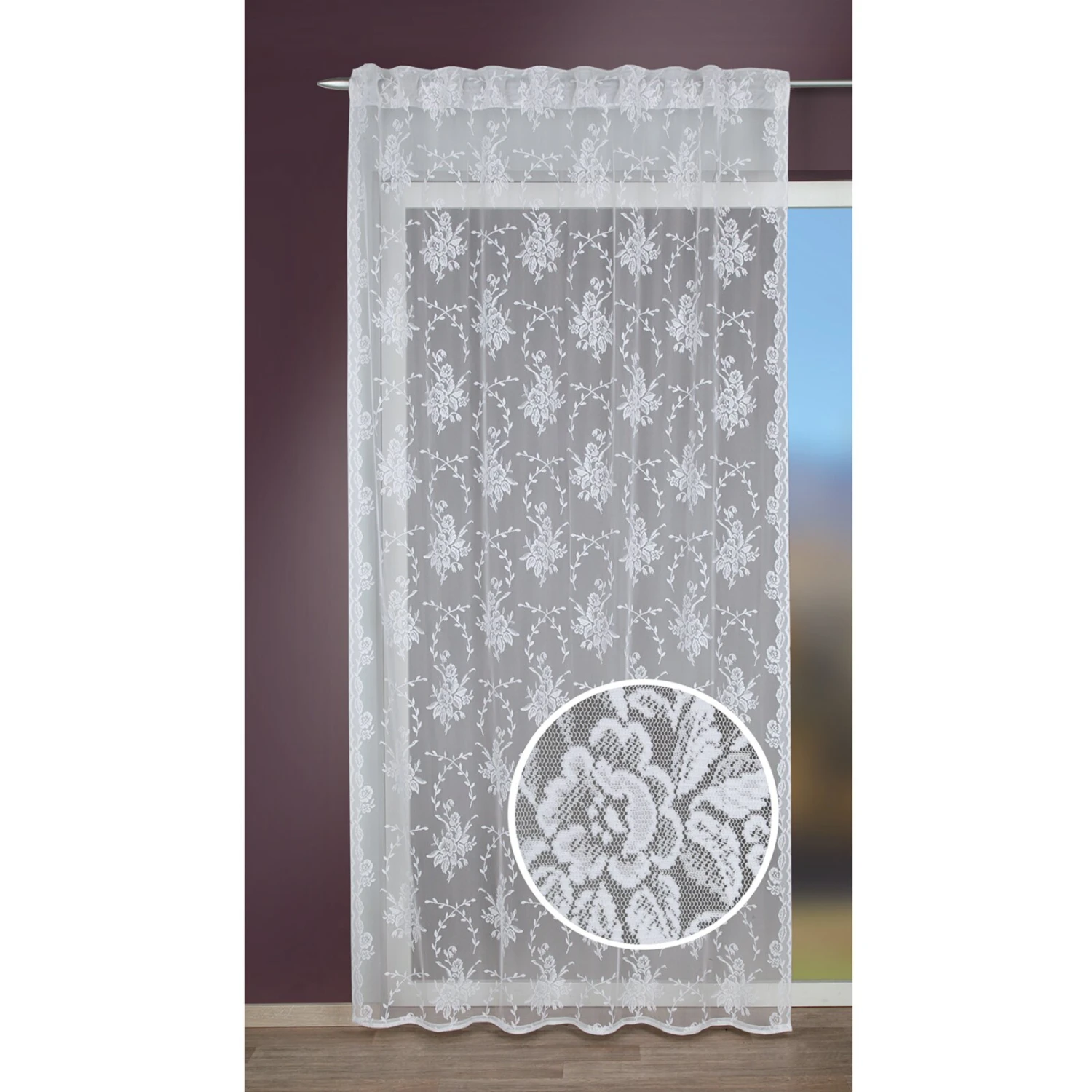 Diese weiße Gardine ist mit einem Rosenmuster versehen und ein echter Hingucker! Sie kann bei bis zu 30°C im Schonwaschgang gewaschen werden und ist etwa 140 Zentimeter breit.