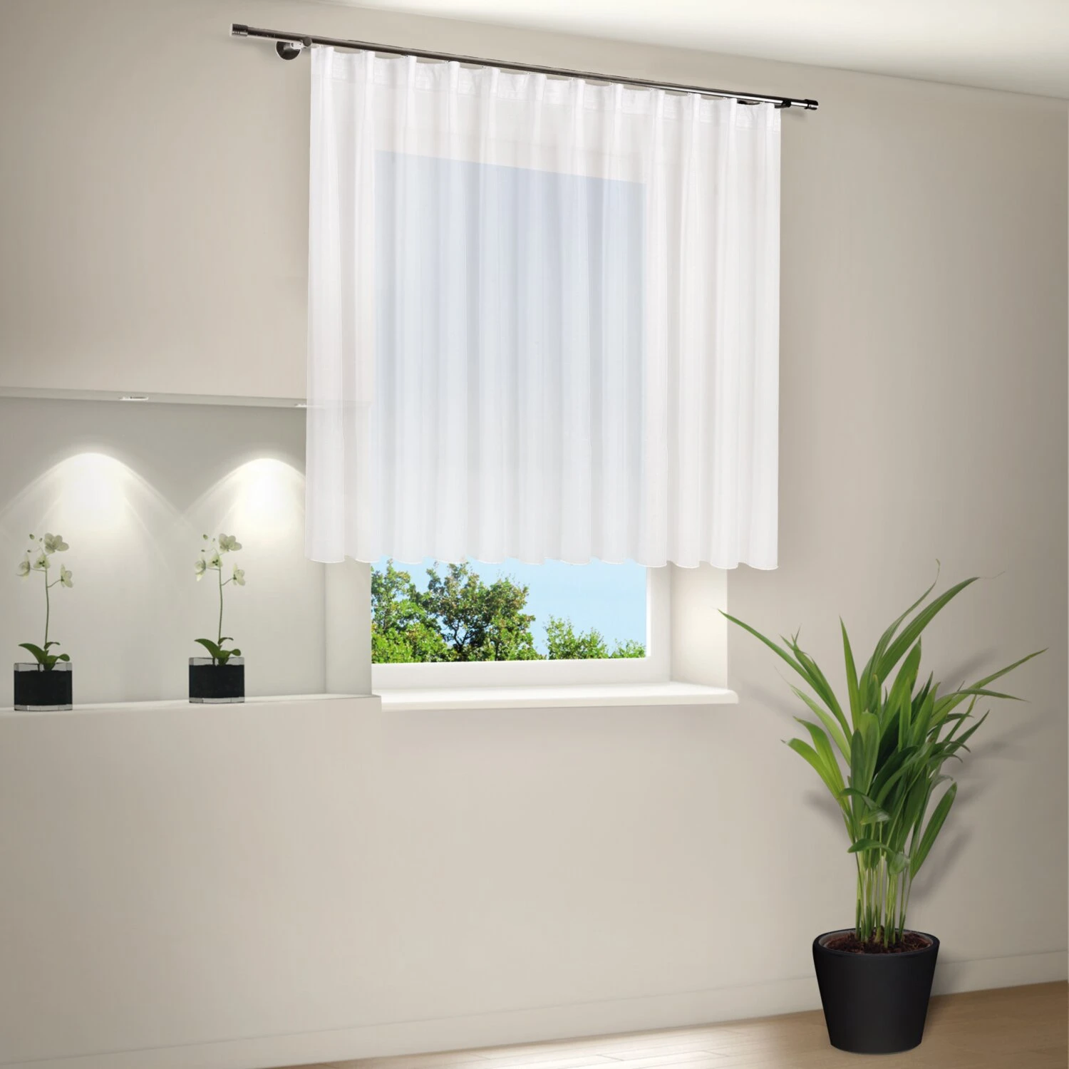 Transparente Gardine aus Voile-Grundware mit leichten Effekten. Durch das moderne Einer-Faltenband kann die Gardine mit Gardinenröllchen/Gleitern an jeder handelsüblichen Gardinenschiene angebracht werden.